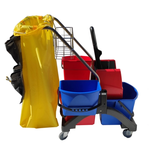 úklidový vozík - komplexně vybavený - nerezová konstrukce madla a držáku vaku.