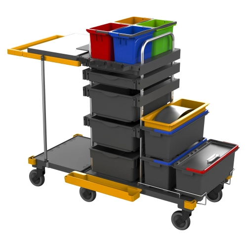 Konfigurace vozíku s držákem vaku 2 x 70 l a systémem předmáčených mopů.