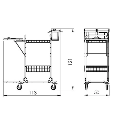 • š113 cm x h50 cm x v121 cm - rozměry vozíku; 1x sklopný držák vaku 120l