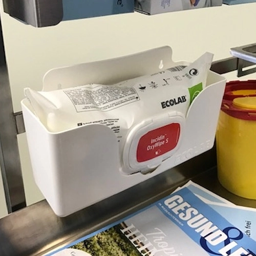 Nástěnný držák Ecolab Flowpack umožňuje rychlý a hygienický přístup k ubrouskům v obalech Flowpack . Je vyrobena z pevného polypropylenu a je dodávána s upevňovacím materiálem pro montáž na stěnu .